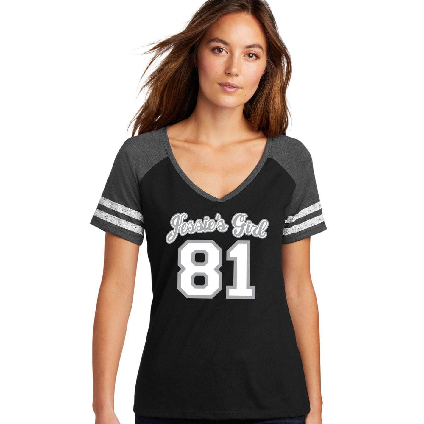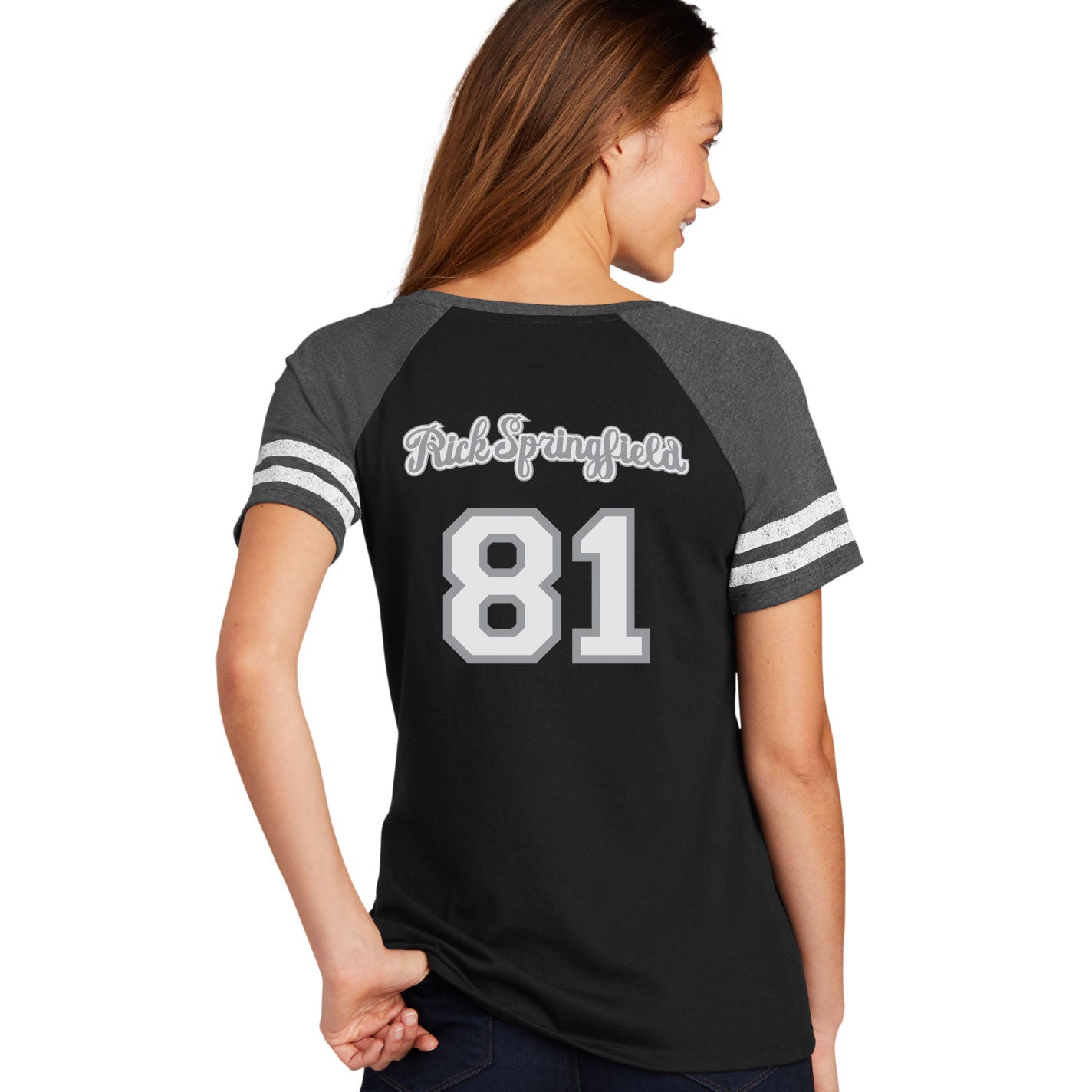 This football style t-shirt will have you feeling like you're part of the Springfield team on game day. Specially designed with stripes on the sleeves and a coverstitched yoke to give a sporty look with exceptional comfort. Jessie's Girl never looked so good!